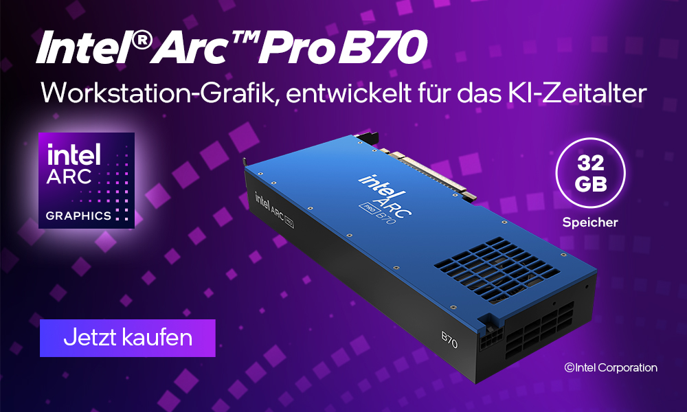 Intel erweitert sein Portfolio an professionellen Grafikkarten: Die Arc Pro B70 AI mit 32GB GDDR6-Speicher richtet sich gezielt an Anwender, die leistungsstarke Hardware für AI-Anwendungen, 3D-Rendering und Datenanalyse benötigen. Die auf der Battlemage-Architektur basierende GPU kombiniert großzügigen Speicher mit hoher Rechenleistung und positioniert sich als Alternative im Workstation-Segment.